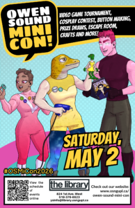 The Owen Sound Mini Con (OSMiCon) is returning! Mark your calendars for a full day of fandom themed programming at the Library. The detailed program will be posted on this page on April 13. Check back to see a full listing of events and exhibitors.